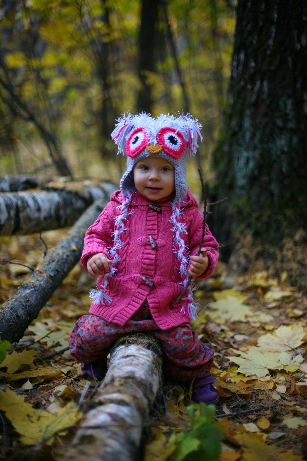 Шапочки "Совунья" и "Бегимоша" добрались до своих владельцев! Ура! С разрешения Натальи Абрамовой, публикуются присланные ею фото (и с волнением жду отзыв о шапочках). Совунья и её владелица Настенька на осенней прогулке.